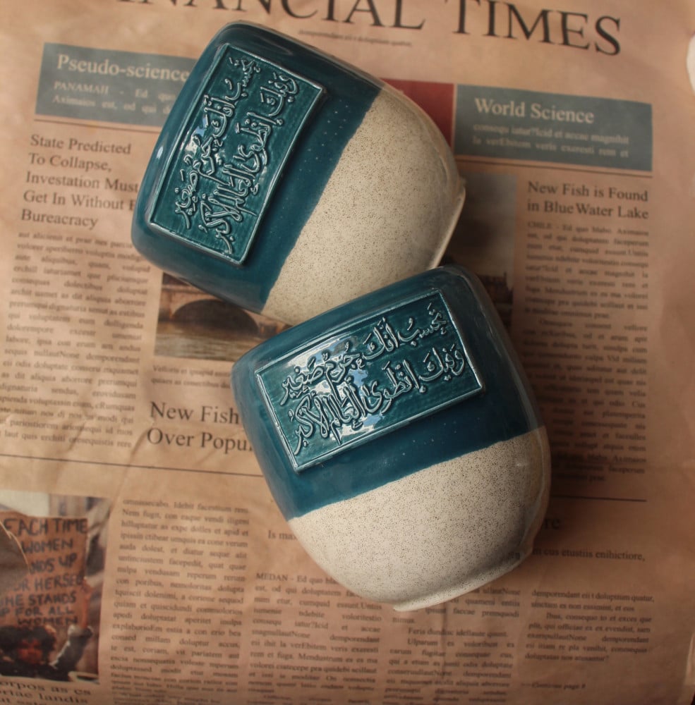 كوب محفور عليه عبارة "وتحسب انك جرم صغير وفيك انطوى العالم الأكبر "